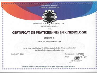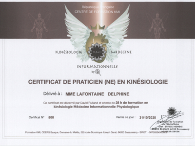 - En 2019/2020 : Obtention de la certification KMI (Déblocage des émotions et des douleurs physiques)